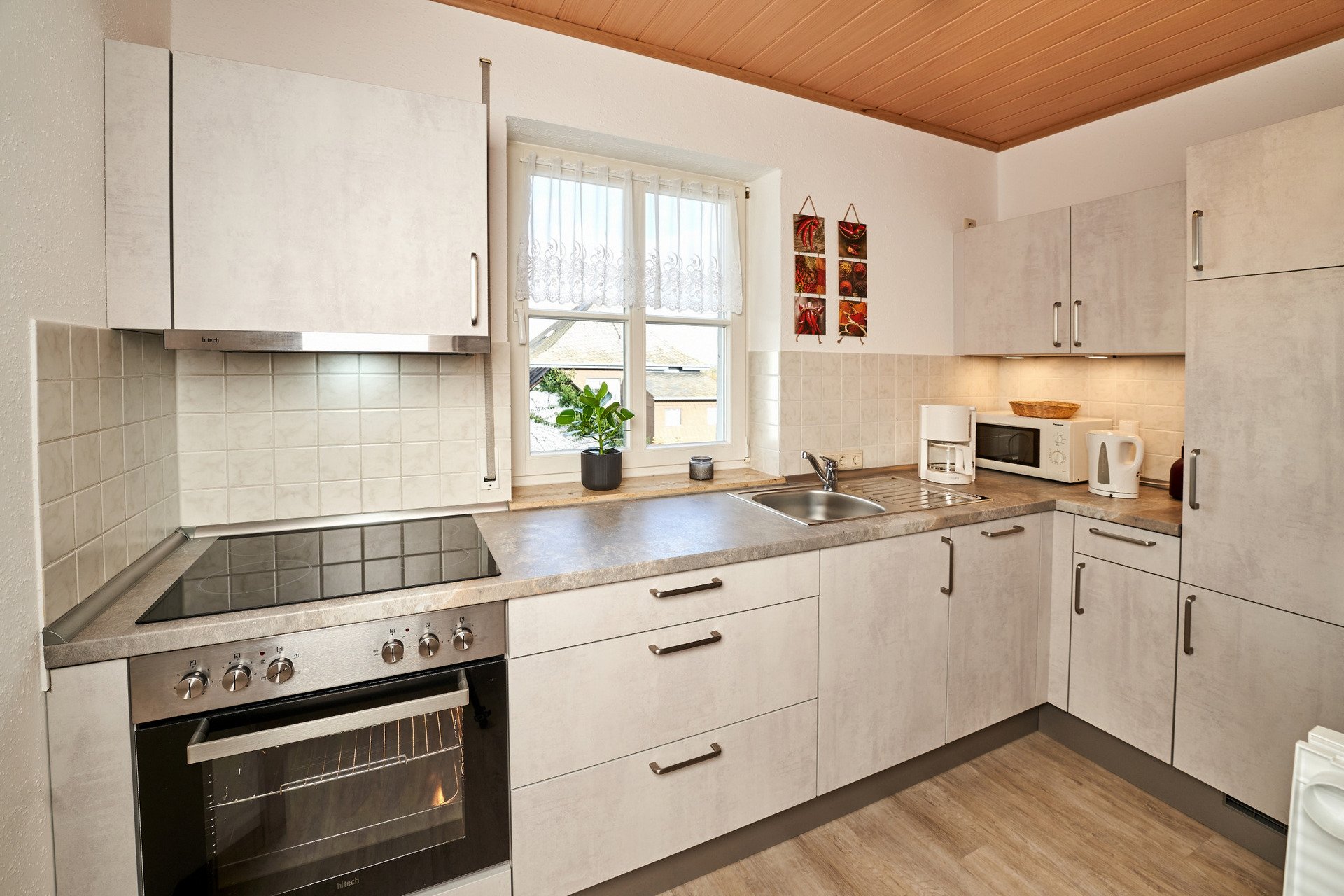 vollausgestattete Küche (Kaffeemaschine, Toaster, Eierkocher, Wasserkocher, Mixer, Kühlschrank mit Gefrierfach, Herd mit Backofen, Mikrowelle, Waffeleisen)
