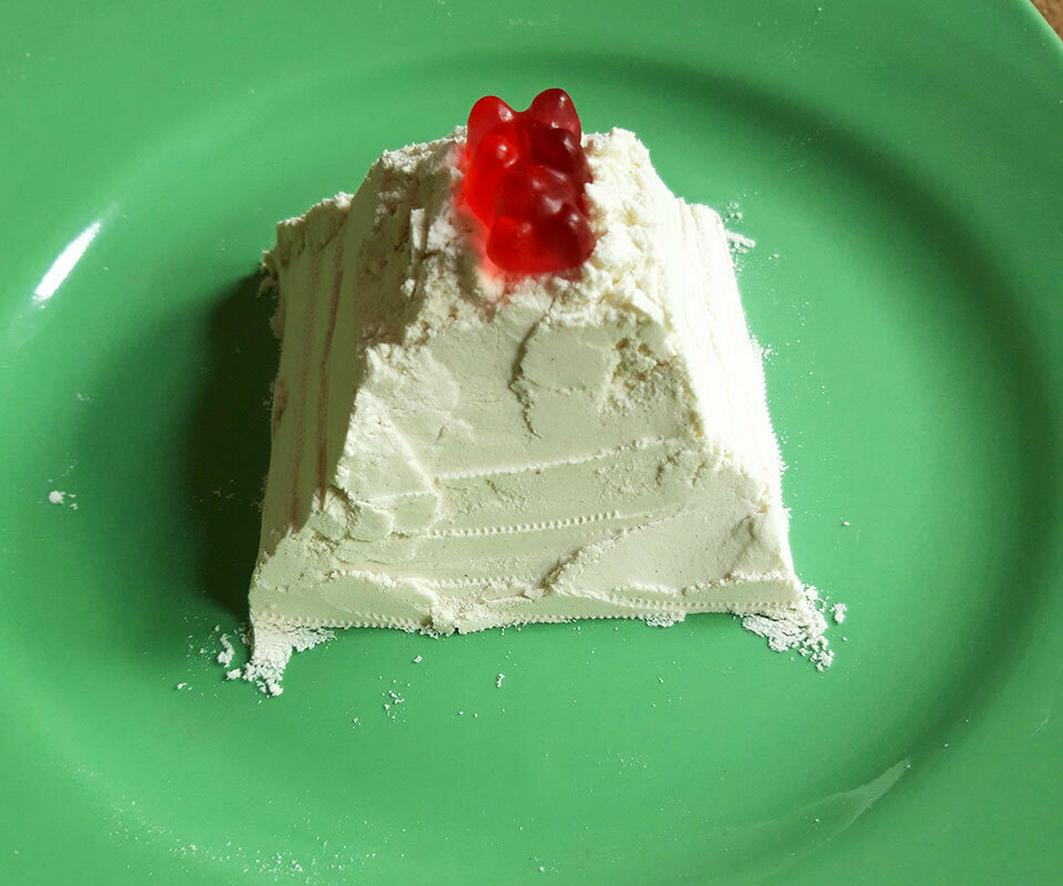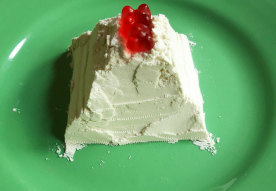 Schüttet etwas Mehl auf die saubere Unterlage und formt daraus eine Pyramide. Die Spitze wird mit der Belohnung gekrönt. Nun darf der Reihe nach jeder Mitspieler mit dem Messer etwas von dem Mehlhaufen abschneiden, aber Achtung - das Gummibärchen darf nicht herunterfallen.